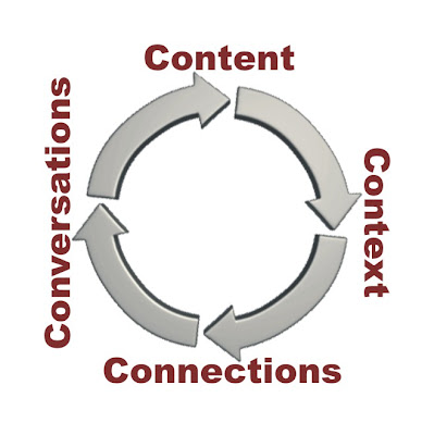 My own definition incorporates the 4 C’s of social media, or the “4 Cons” if you will: “online tools that permit users to create content, within a given context, to help establish connections and engage in conversations.” Okay, that’s a bit awkward in words, but makes more sense as a picture:The starting point is typically content—a blog post, video, podcast, article, photo, a resource such as an industry-specific glossary or calendar of events, or other means of expression. The context in this case is the particular tool, website or other online venue where the content will be shared: in a blog, a social networking or bookmarking site, a media sharing site (e.g. Flickr or YouTube), a wiki, a forum, a Squidoo lens, wherever. Sharing content enables one to make connections; to find people with similar interests. For example, someone with an interest in enterprise data warehouse technology will probably read data warehouse blogs, watch data warehouse videos, listen to data warehouse podcasts, and follow people who write about enterprise data warehouse technology on Twitter.