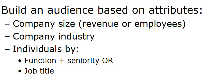 You can target on a number of characteristics such as company size (by employees or revenue) and industry. You can target individuals at those companies based on EITHER title OR a combination of function (e.g., sales, operations, finance) and job seniority.